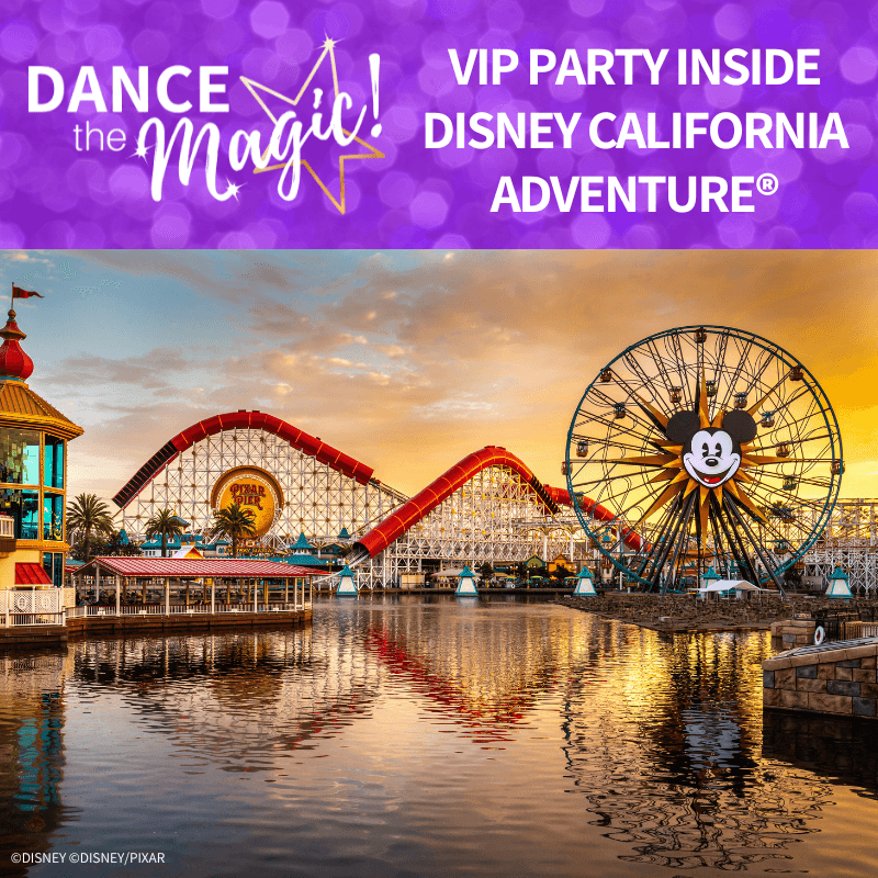 Party in the Park After Dark inside Disney California Adventure® Park: Experience a private party inside Disney California Adventure® Park after regular park closing! All Dancers & Guests will receive exclusive access to attractions on Pixar Pier, Meet & Greets with special Disney Characters, DJ & Dancing and treats & desserts